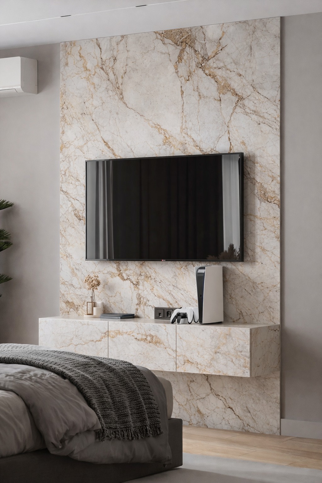 В спальне ТВ-зона должна быть ненавязчивой. Хорошо работает решение, когда телевизор становится частью композиции с тумбой/комодом, а камень используется как тонкий акцент — чтобы добавить фактуру, но не создавать ощущение «тяжёлой» стены.