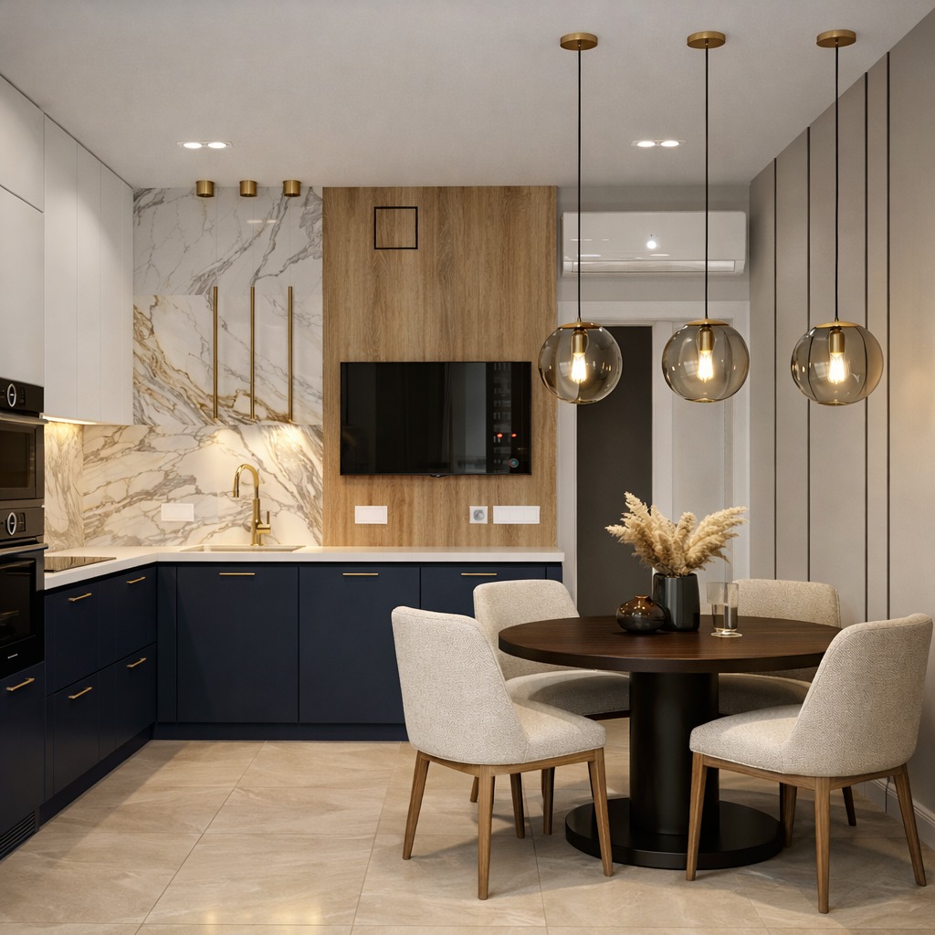 На кухне важно, чтобы экран не попадал под прямой свет и не находился рядом с источниками жара. Идеально — когда телевизор виден из зоны готовки и обеденного места, но при этом не мешает рабочему процессу.