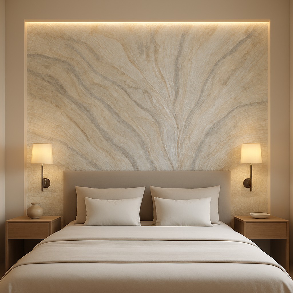 В спальне панно из натурального камня чаще всего располагают за изголовьем кровати.
