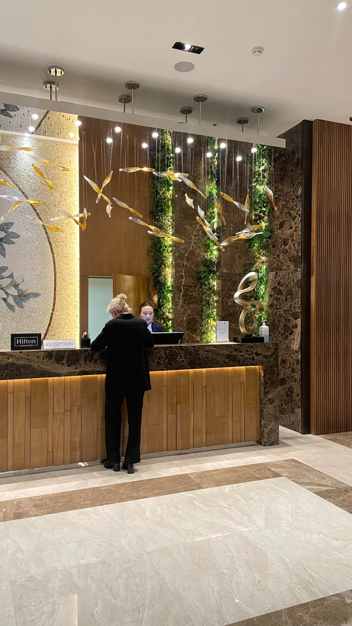 Крупноформатные панели и минимальные швы создают «тихий» фон бренда и подчёркивают фирменный стиль в зоне встречи гостей.