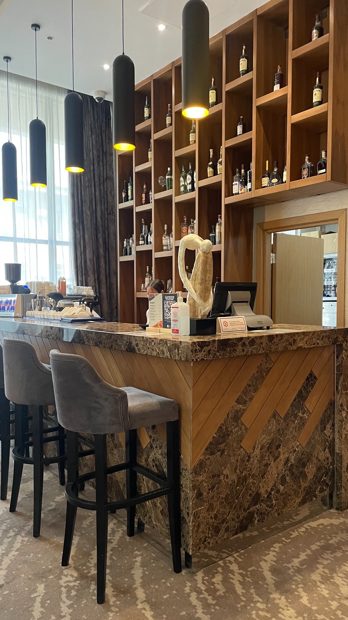 Камень + металл/шпон/крашенный МДФ: сохраняем тактильность камня и улучшаем эргономику персонала.