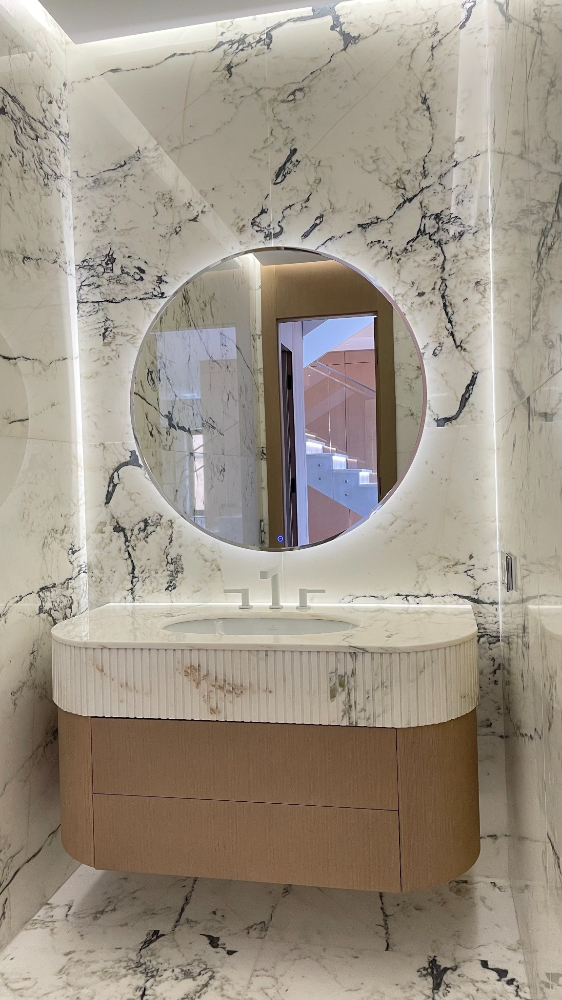 Проектируем и изготавливаем ванные комнаты из камня: стеновые панели, столешницы с интегрированной раковиной, душевые поддоны и фартуки. Работаем со слэбами мрамора, кварцита, гранита и оникса, подбираем текстуру под интерьер, выполняем точный раскрой и аккуратный монтаж «под ключ» в Алматы.